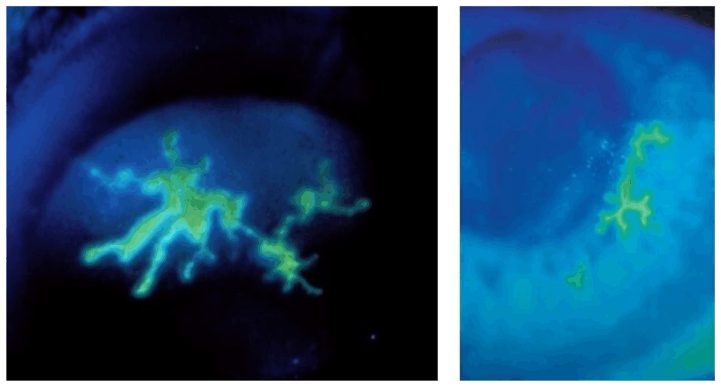 特徴的なのは「樹枝状潰瘍(じゅしじょうかいよう)」と呼ばれる傷です。木の枝が伸びるような、あるいは稲妻のような形をしており、眼科医が特殊な染色液と顕微鏡で確認することで診断できます [8]。この傷は、ウイルスが増殖しながら細胞を壊すことでできます。痛みや異物感、充血、涙、まぶしさなどの症状が出やすいのが特徴です。